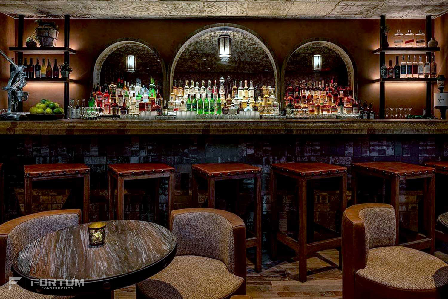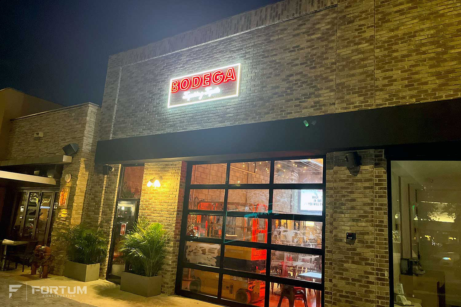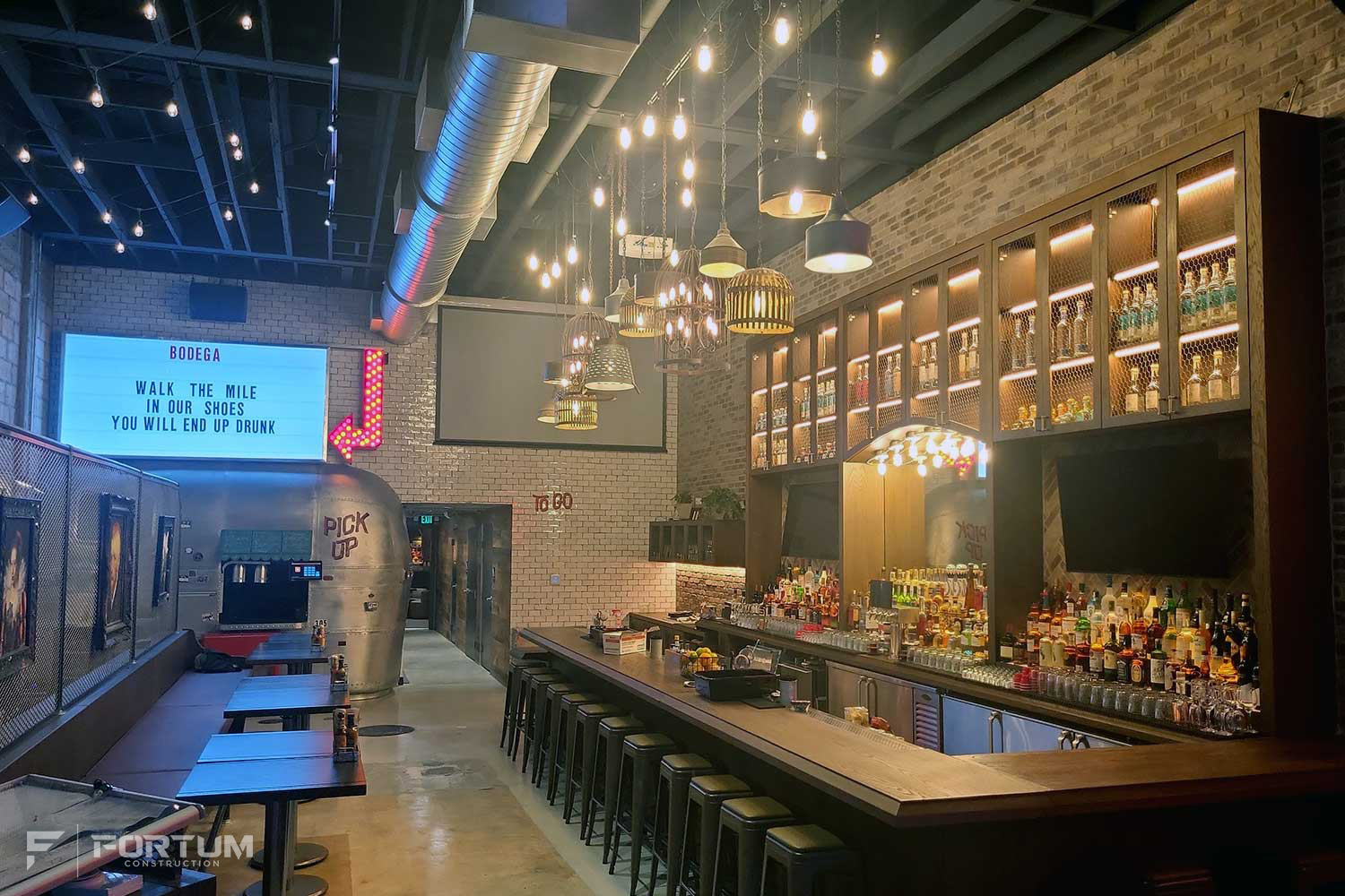 The scope of work comprises of a full gut and renovation of an existing restaurant space with a new construction of a structural steel mezzanine structure with a new Back of House design including a speakeasy and a complete re-façade of the main entry with new storefront door, overhead glass operated door, and old mill brick veneer.